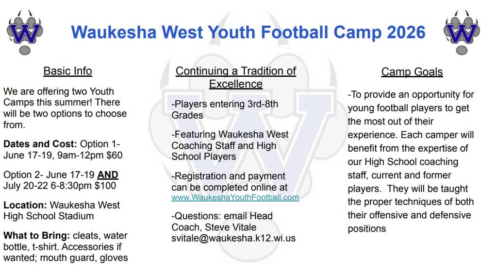 The Waukesha Youth Football and Cheer leading program is committed to providing all youth in Waukesha the opportunity to participate in football and cheer leading in a safe and enjoyable environment. As part of this commitment, we will emphasize the fundamentals of football and cheer leading and the knowledge the youth will need to play football and cheer at the high school level. We provide the opportunity for playing football and cheer leading to all youth, regardless of athletic capability. In addition, no youth will be excluded based on financial considerations.